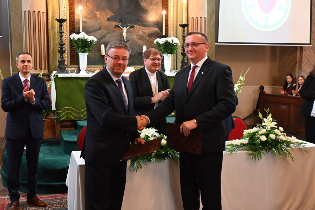 „Szeretnék bízni abban, hogy ma olyan ajtók nyílnak meg, melyeknek köszönhetően barátság alakul ki. Amelyek bizonyos értelemben túllépnek a határon. Ahol a múlt bélyege nem bélyegzi meg a jövőt” – mondta beszédében Mgr. Peter Mihoč püspök. Beszélt a kapcsolódás, a kapcsolatok fontosságáról a vallások, nemzetek, emberek között, hozzátéve, hogy a most megkötött együttműködés új lehetőséget jelent a két város egyházai és iskolái között is. Ez azonban nem csak az egyház is az iskolák közötti kapcsolat miatt fontos, hanem a diákok a jövőt is jelentik.