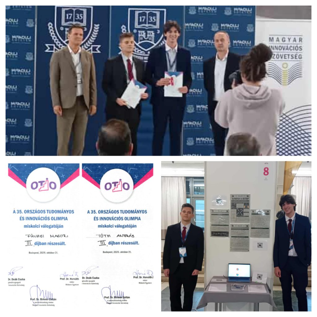 Iskolánk két tanulója, Füvesi Magor és Tóth András (10.b) a Miskolci Egyetemen megrendezett Országos Tudományos és Innovációs Olimpia regionális válogatóján „matematika, fizika és informatika” kategóriában harmadik helyezést ért el!