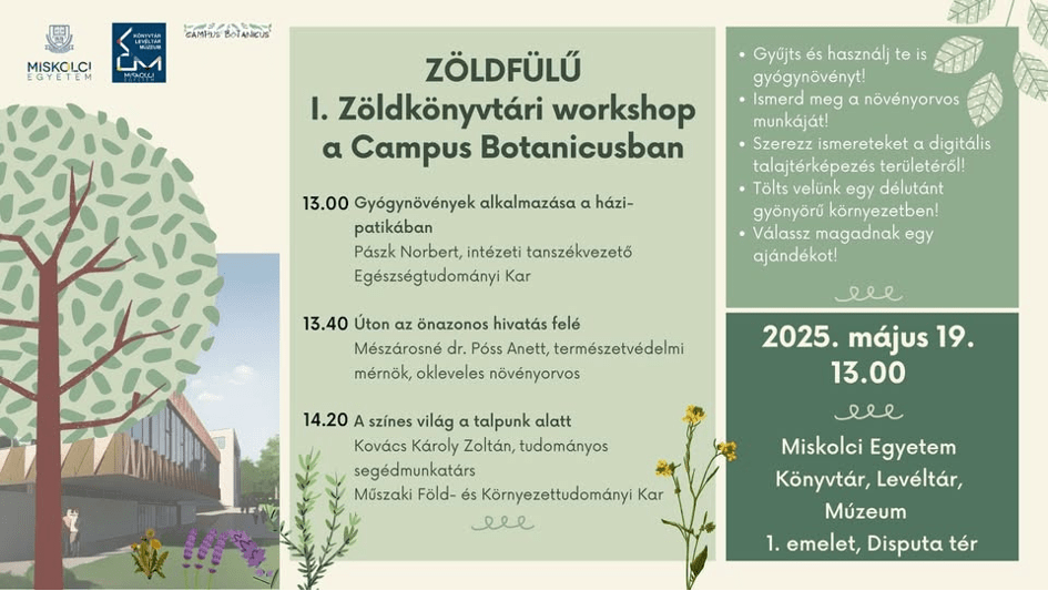 A Miskolci Egyetemen 2025. május 19-én szervezték meg a Zöldfülű I. Zöldkönyvtári workshopot. Iskolánk biológia tagozatos diákjai is részt vettek a rendezvényen. Sok hasznos tudás birtokába jutottak, akár a pályaválasztás alapjait is elhinthették az oktatók. Az előadások végén limonádé és gyümölcs várta a diákokat, valamint egy kis ajándékkal kedveskedtek a szervezők.